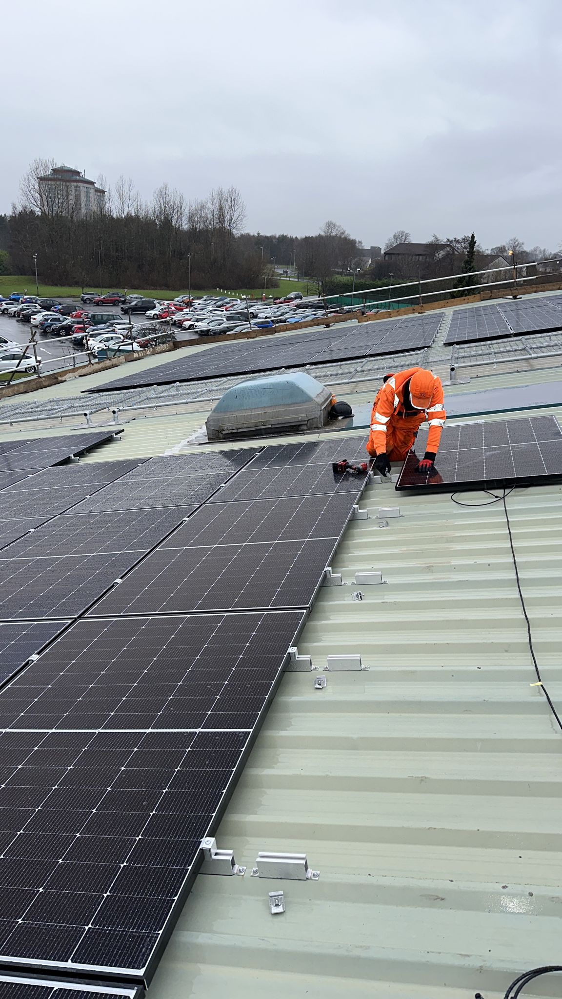 The solar panel installation at David Lloyd Renfrew spans three buildings across the site. To maintain a high standard of professionalism and minimise disruption to gym members, we established a secure site compound with clear signage to explain the project and its benefits. Waste disposal and secure material storage were carefully managed throughout the process.